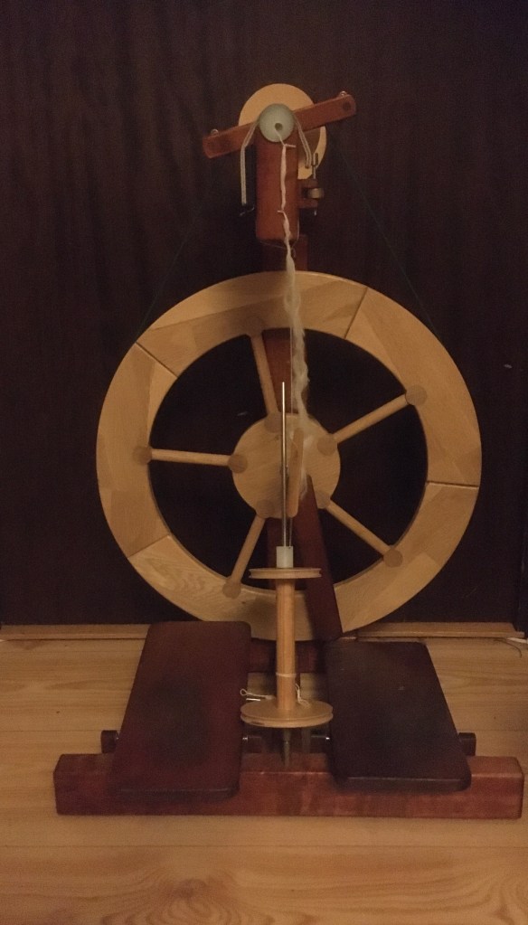 För några år sedan köpte jag mig en ny, en upprättstående variant tillverkad av en man i Vadstena. Den är väldigt bra att spinna angoraullen på.